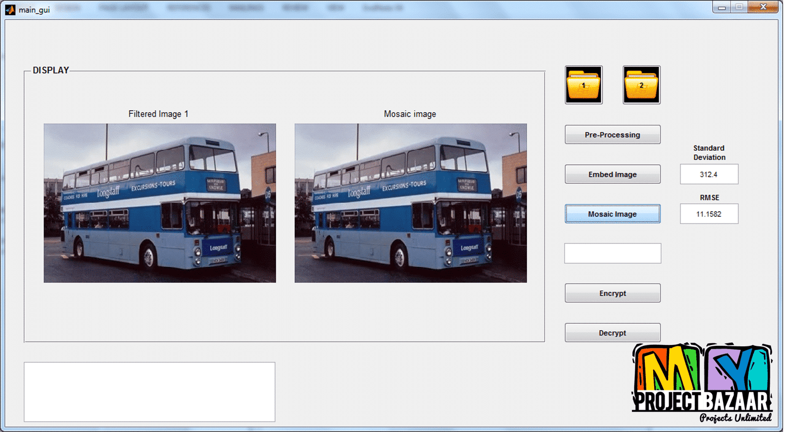 Abstract?A New Secure Image Transmission Technique via Secret-Fragment-Visible Mosaic Images by Nearly Reversible Color Transformations. A new secure image transmission technique is proposed, which transforms automatically a given large-volume secret image into a so-called secret-fragment-visible mosaic image of the same size. The mosaic image, which looks similar to an arbitrarily selected target image and may be used as a camou?age of the secret image, is yielded by dividing the secret image into fragments and transforming their color characteristics to be those of the corresponding blocks of the target image. Skillful techniques are designed to conduct the color transformation process so that the secret image may be recovered nearly losslessly. A scheme of handling the over?ows/under?ows in the converted pixels? color values by recording the color differences in the < Final Year Projects 2016 > untransformed color space is also proposed. The information required for recovering the secret image is embedded into the created mosaic image by a lossless data hiding scheme using a key. Good experimental results show the feasibility of the proposed method.