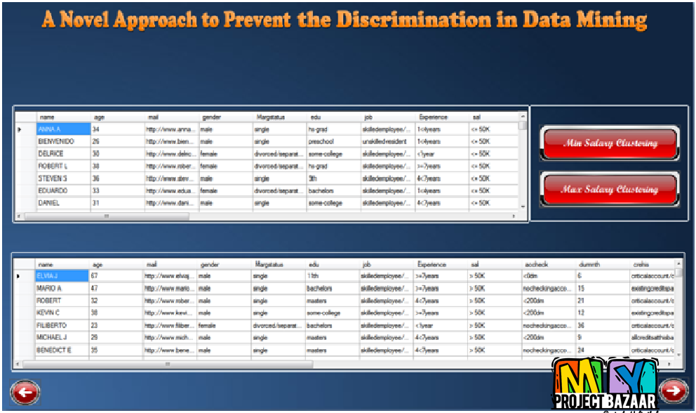 Abstract? Data mining is an increasingly important technology for extracting useful knowledge hidden in large collections of data. There are, however, negative social perceptions about data mining, among which potential privacy invasion and potential discrimination. The latter consists of unfairly treating people on the basis of their belonging to a specific group. Automated data collection and data mining techniques such as classification rule mining have paved the way to making automated decisions, like loan granting/denial, insurance premium computation, etc. If the training data sets are biased in what regards discriminatory (sensitive) attributes like gender, race, religion, < Final Year Project > etc., discriminatory decisions may ensue. For this reason, anti-discrimination techniques including discrimination discovery and prevention have been introduced in data mining. Discrimination can be either direct or indirect. Direct discrimination occurs when decisions are made based on sensitive attributes. Indirect discrimination occurs when decisions are made based on nonsensitive attributes which are strongly correlated with biased sensitive ones. In this paper, we tackle discrimination prevention in data mining and propose new techniques applicable for direct or indirect discrimination prevention individually or both at the same time. We discuss how to clean training data sets and outsourced data sets in such a way that direct and/or indirect discriminatory decision rules are converted to legitimate (nondiscriminatory) classification rules. We also propose new metrics to evaluate the utility of the proposed approaches and we compare these approaches. The experimental evaluations demonstrate that the proposed techniques are effective at removing direct and/or indirect discrimination biases in the original data set while preserving data quality.