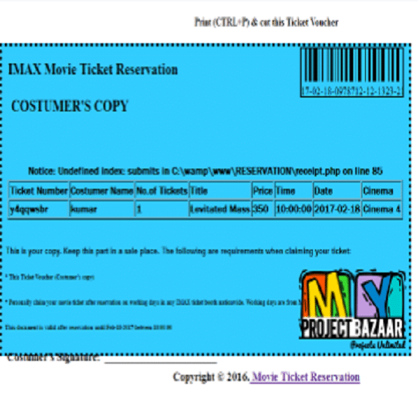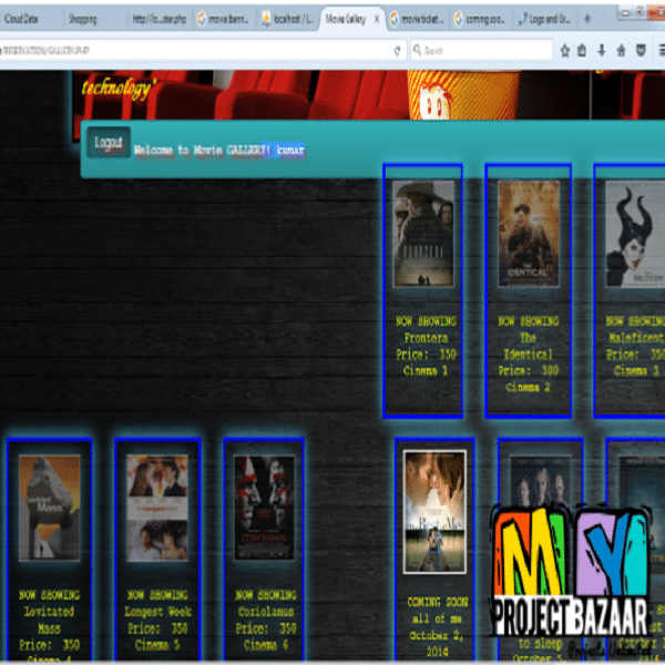 specially designed to make your booking experience better. Log on, navigate and find out for yourselves and if time permits leave your valuable feedback. Customers may view the contents of any movie show at any time and may book any movie ticket as needed. The program automatically calculates the subtotal and grand total. When a visitor decides to finally book the ticket, the order information including the buyer’s name, address and billing instruction is stored in the database securely and payment has been made. The combo booking is also provided at the time of booking the ticket and there?s a wonderful facility of delivering the combos at your seat when you are watching the movie. You need to register a new user whenever you have first visited or site then for future it will be stored in our database permanently and you can book you movie ticket at any time you want with this username and password < final year projects >